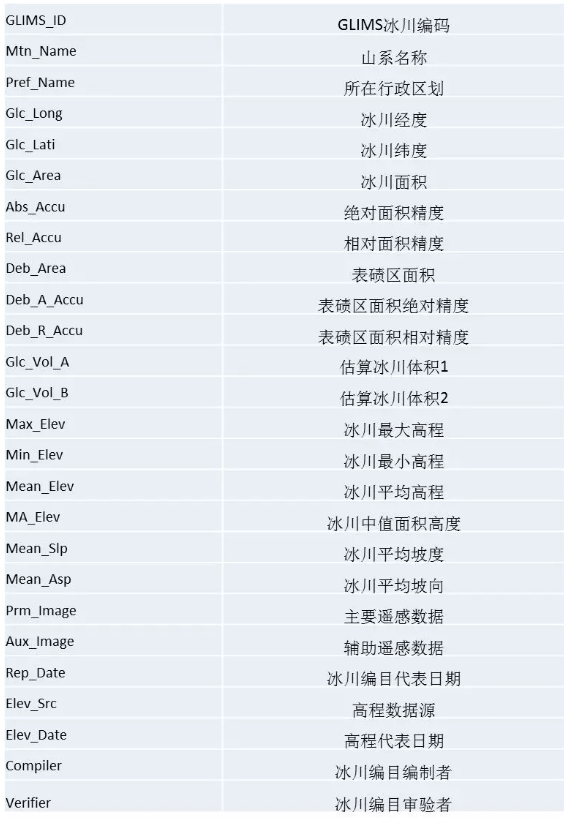 第二次中国冰川编目参数表 改编自《中国第二次冰川编目——数据说明》